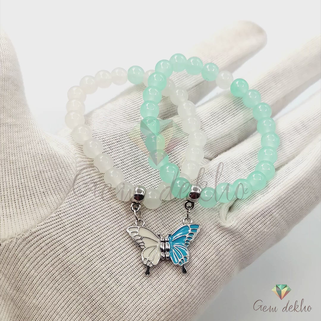 Celebrate love, harmony, and connection with this elegant Butterfly Charm Magnetic Bracelet Set, designed for couples and close friends. Each bracelet is made with synthetic beads in soothing pine aqua and off white colors, symbolizing peace, balance, and unity. The magnetic charm gently pulls the bracelets together, representing the unbreakable bond between two souls.